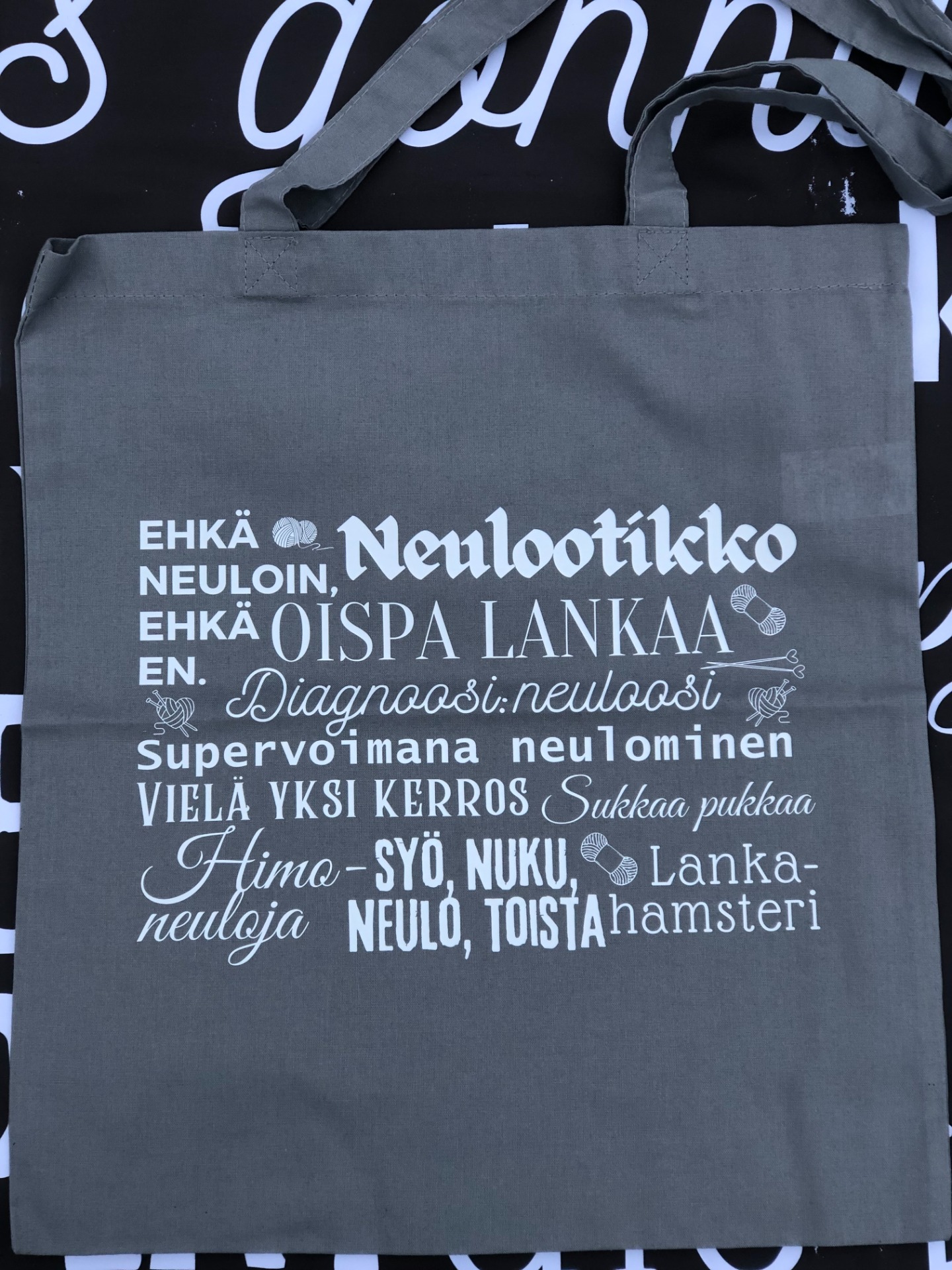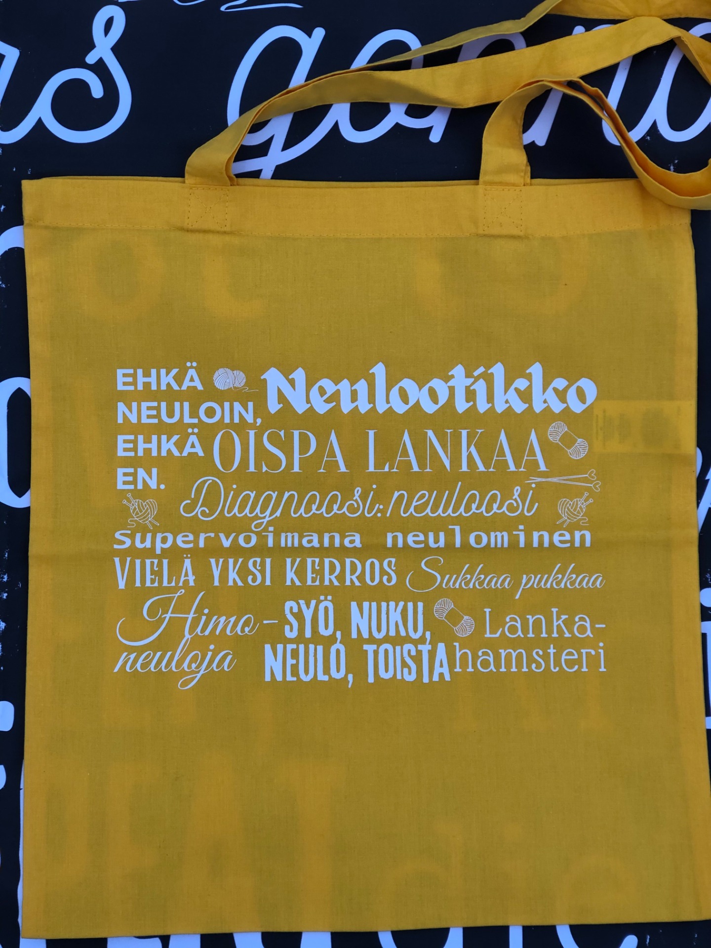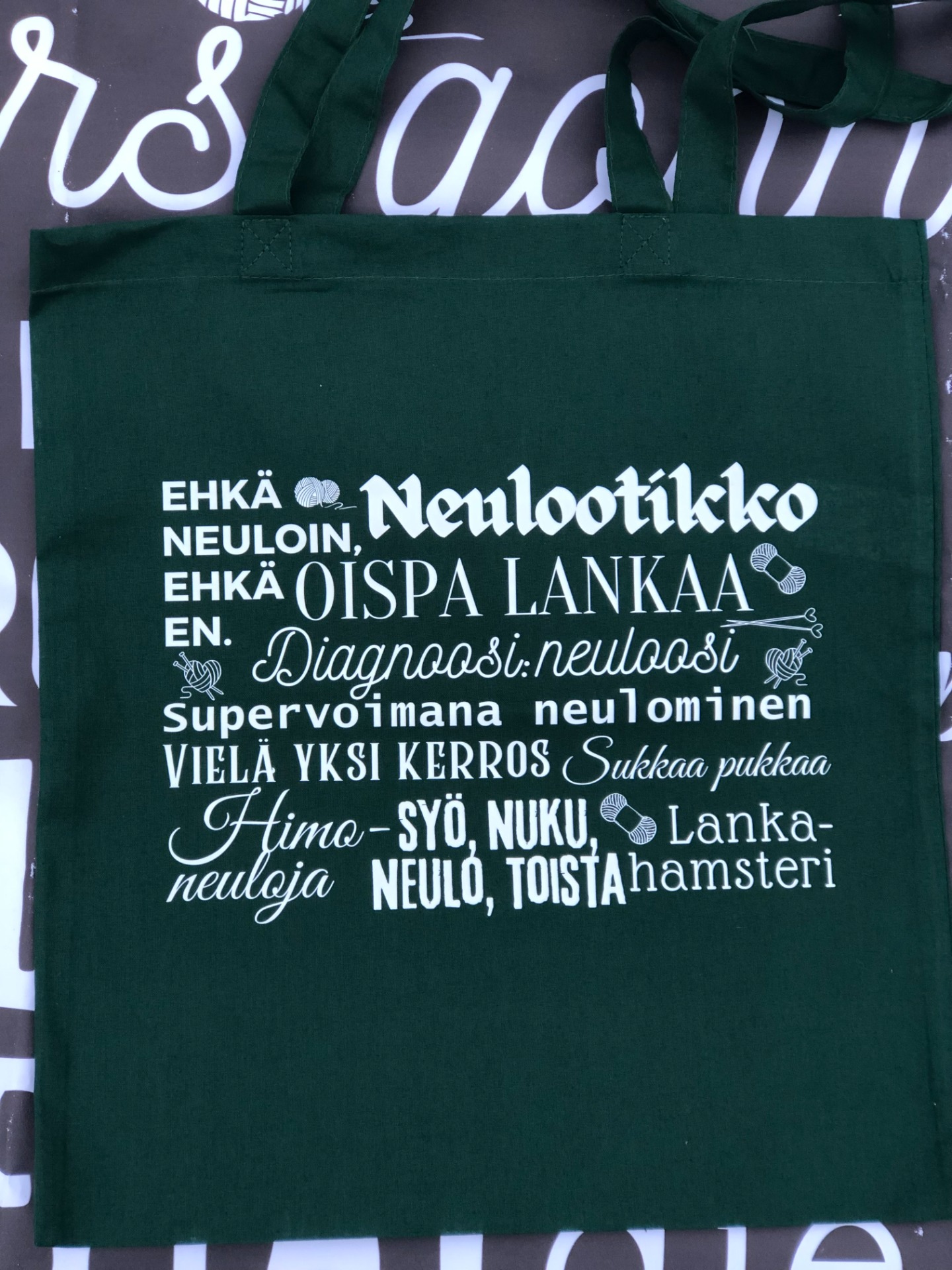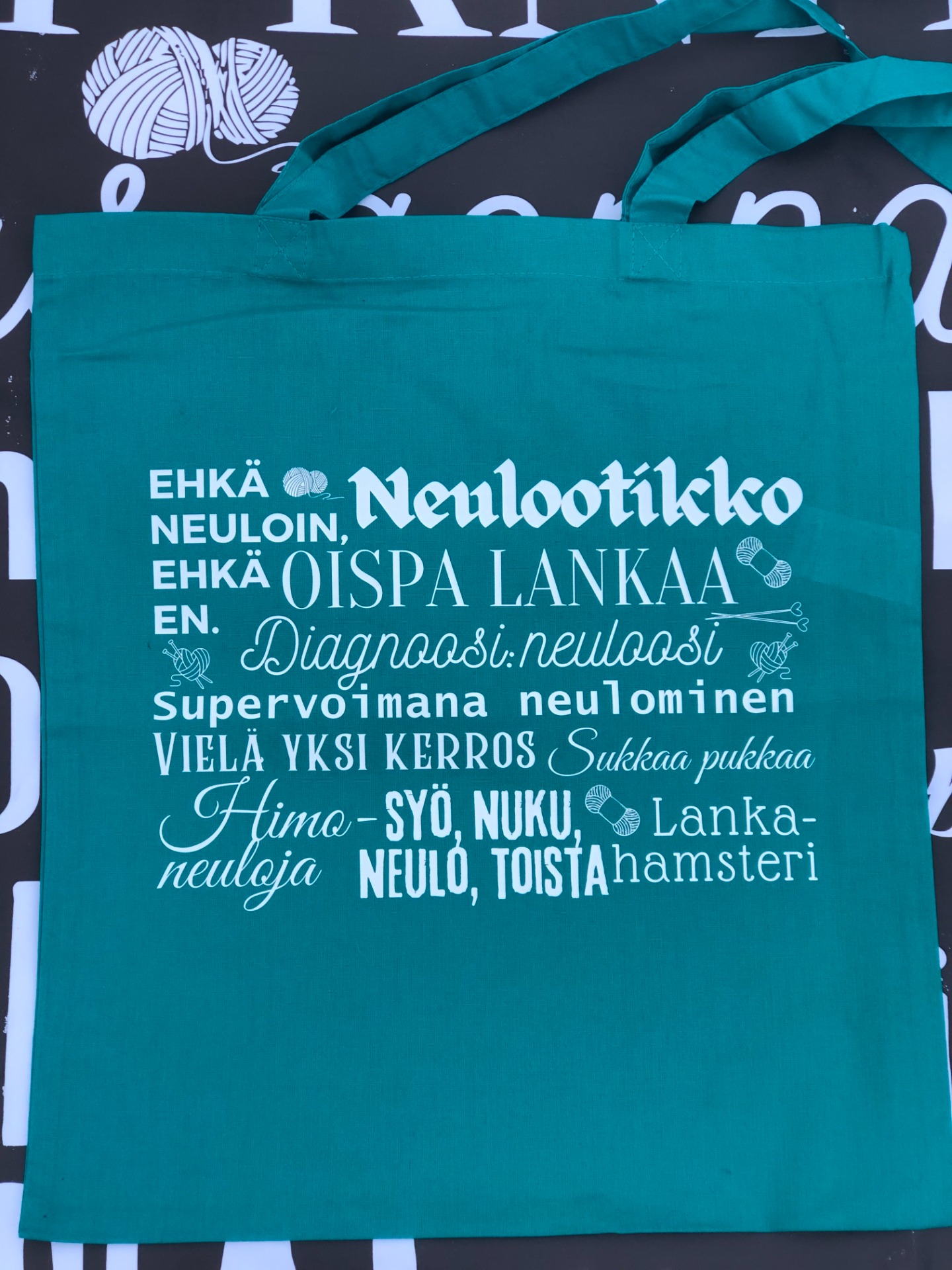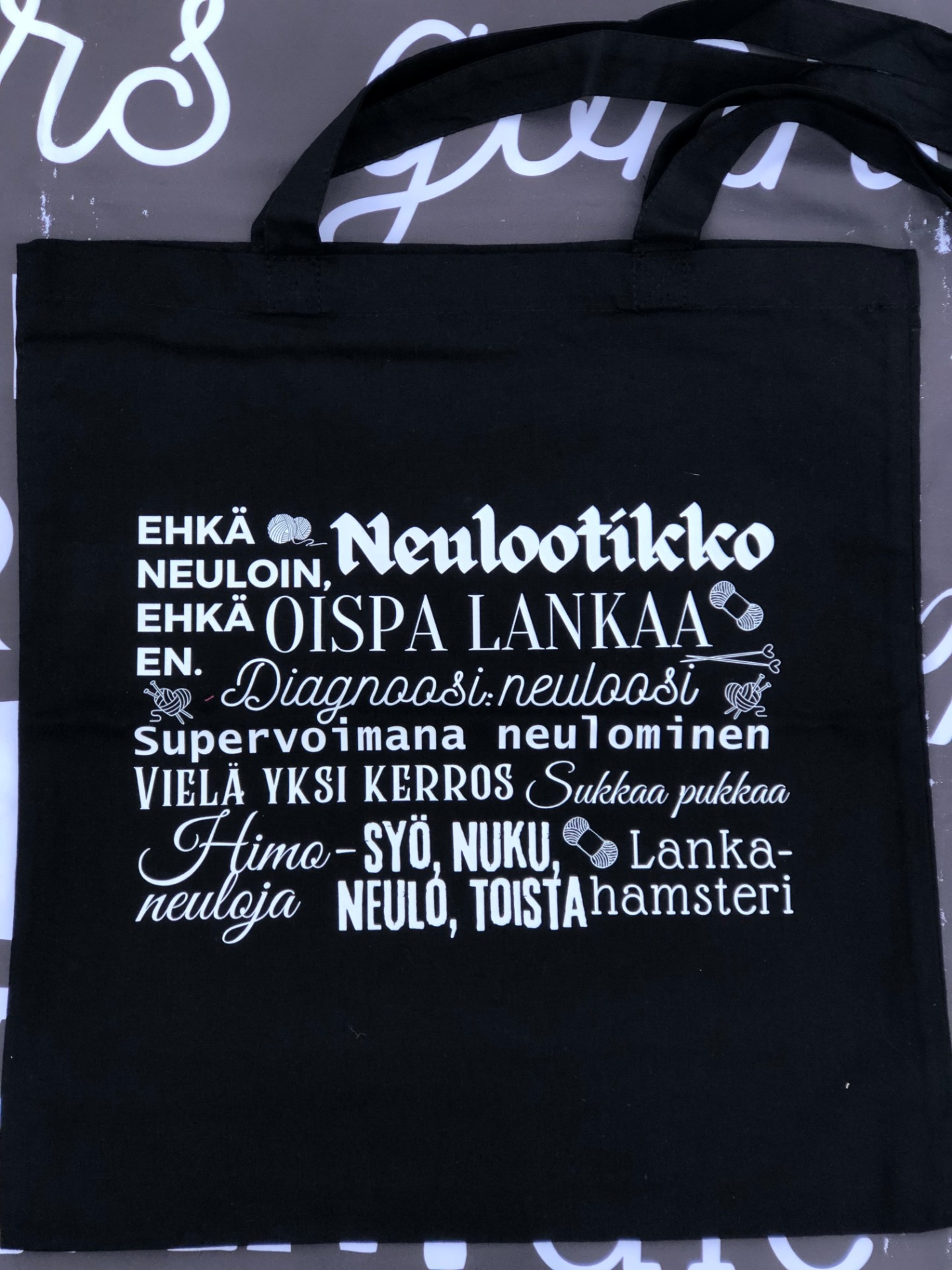 Ihana puuvillakassi Neulootikoille, Lankahamstereille ja Himoneulojille sopivalla suomenkielisellä tekstiprintillä. Printti suunniteltu Varpaisjärvellä, kassit painettu Haminassa.