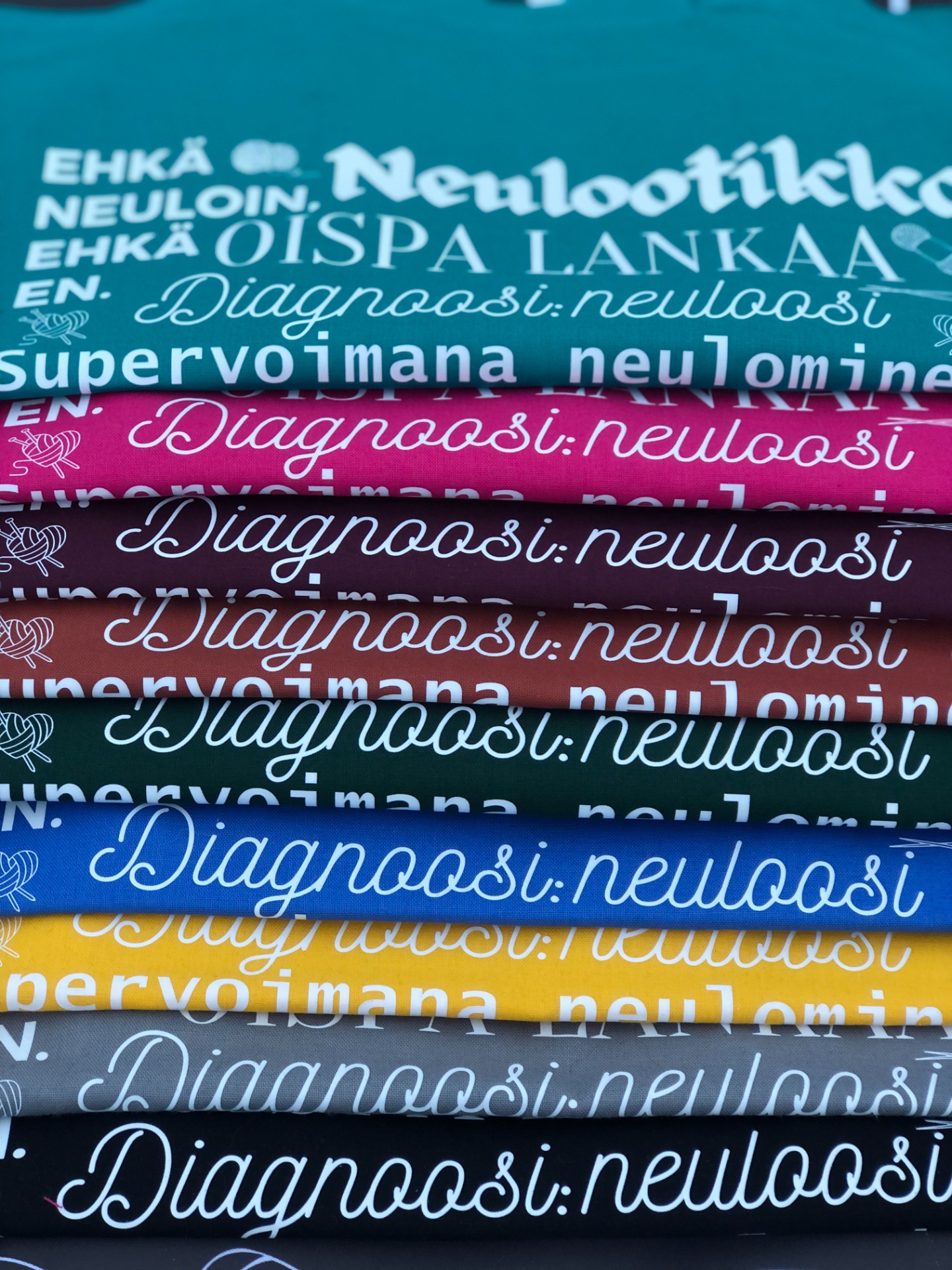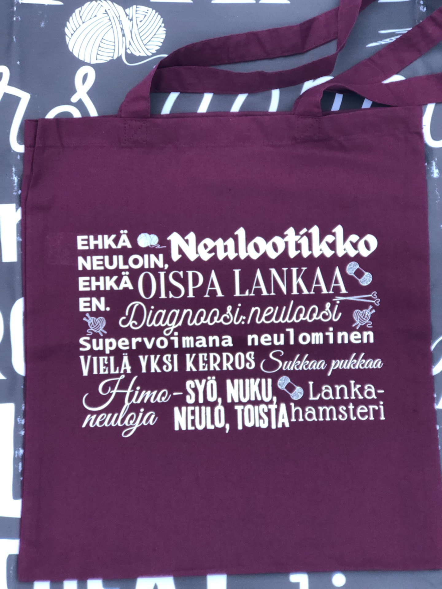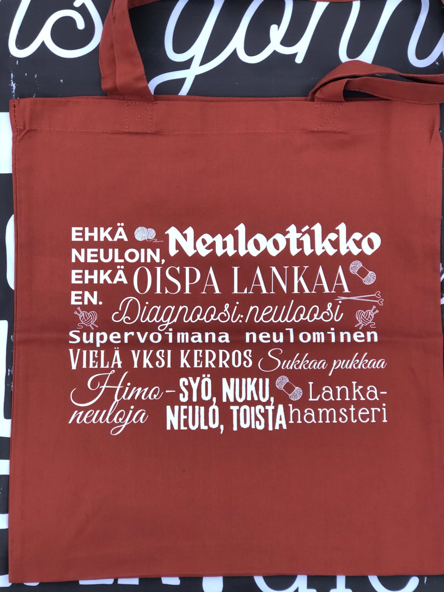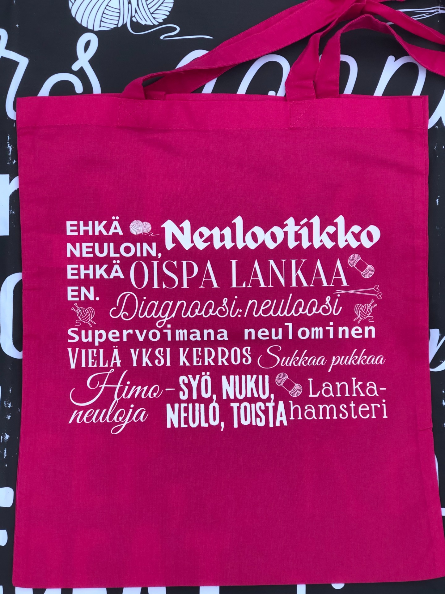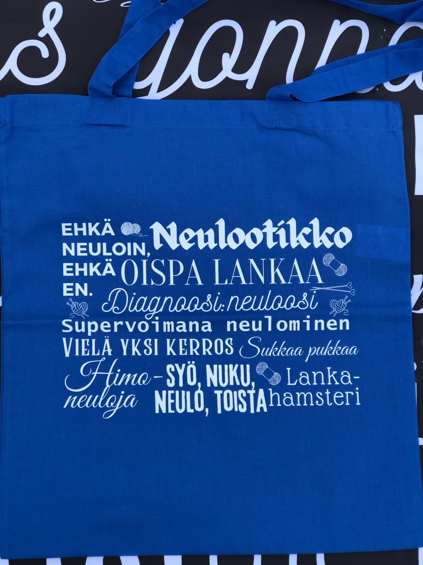 Ihana puuvillakassi Neulootikoille, Lankahamstereille ja Himoneulojille sopivalla suomenkielisellä tekstiprintillä. Printti suunniteltu Varpaisjärvellä, kassit painettu Haminassa.